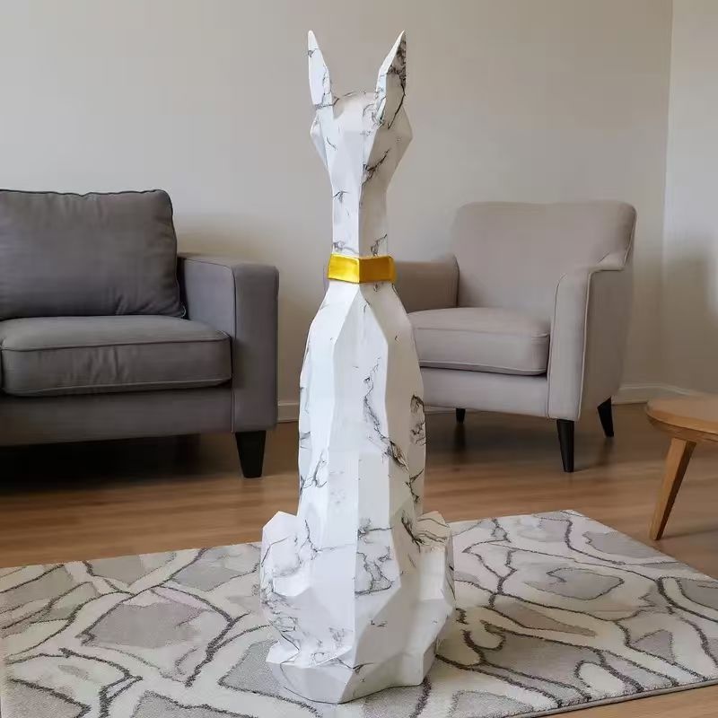 Geometryczna sylwetka psa w jasnym, marmurowym wykończeniu, połączona ze złotymi akcentami i metaliczną tacą, tworzy dekorację w stylu nowoczesnej elegancji. Idealna do wnętrz, które mają być jasne, stylowe i dopracowane w detalach.